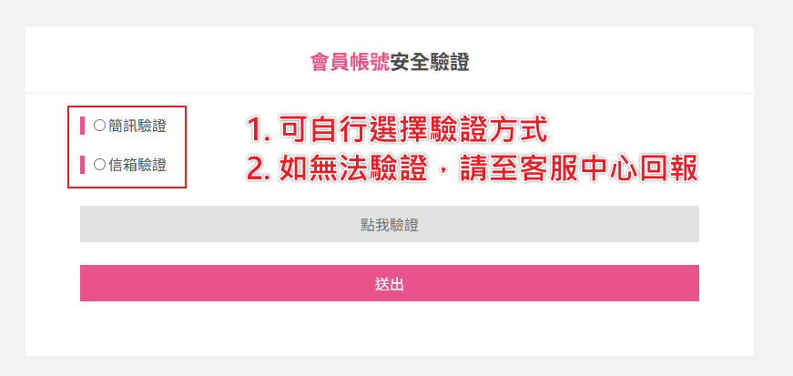 ※限會員資料內填寫的email或手機進行驗證,如無會員資料無填寫,請至客服中心回報。