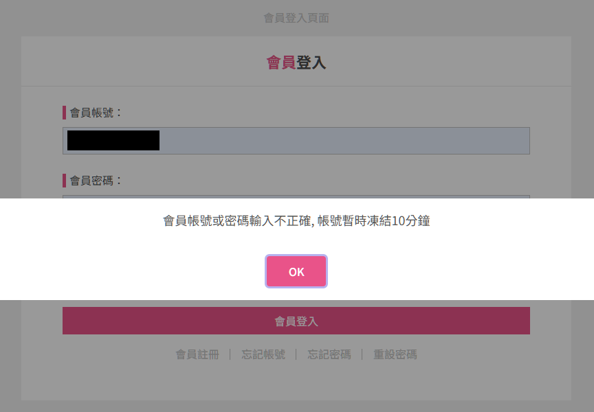 ● 平台會員登入失敗達5次,將會進行臨時封鎖凍結10分鐘。
