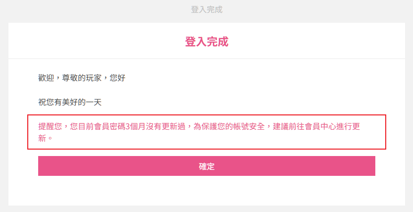 ● 平台登入後,系統會自動偵測,如會員密碼達3個月以上沒有更新,會跳出提醒訊息。